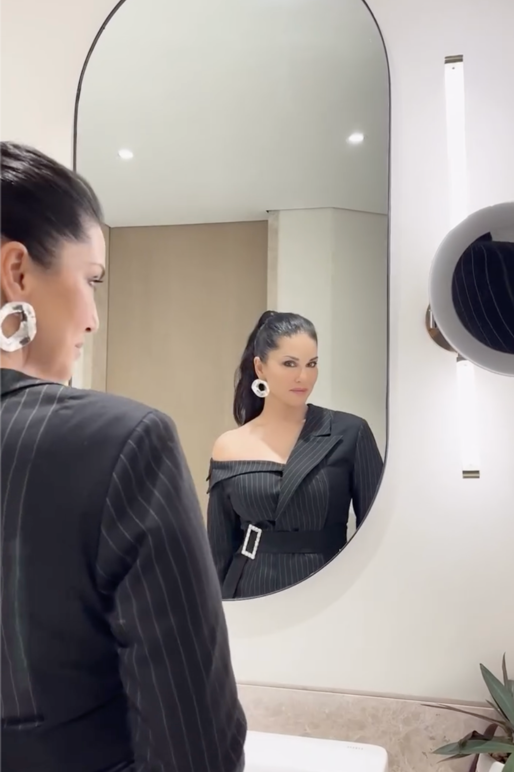 Sunny Leone in Double Breasted Off Shoulder Suit Ensemble in Midnight Noir with pinstripes